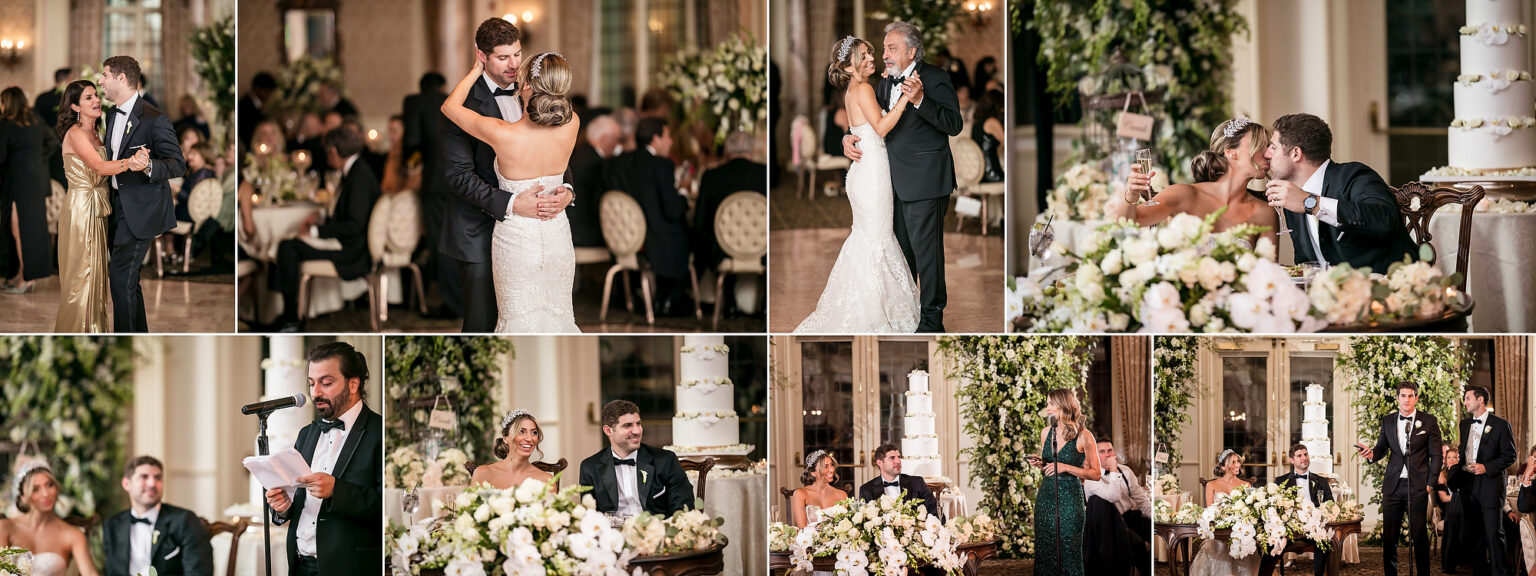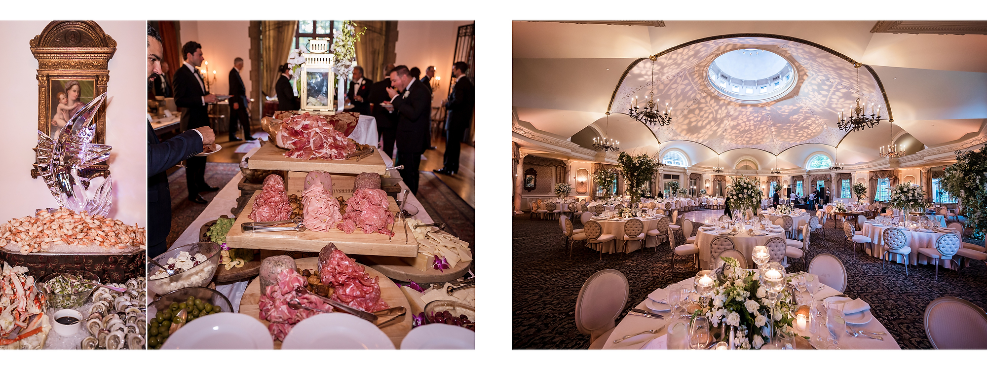 Following their romantic ceremony, guests enjoyed an exquisite cocktail hour on the estate grounds, sipping champagne and indulging in gourmet hors d’oeuvres. As the sun set, the celebration moved indoors, where the grand ballroom was transformed into a stunning reception space. Highlights of the night included: