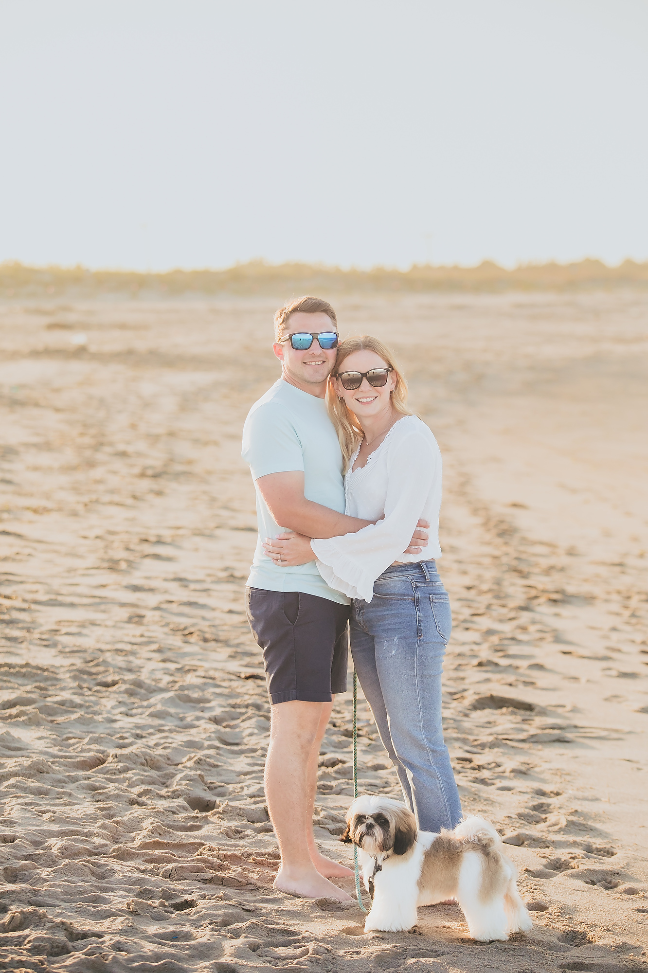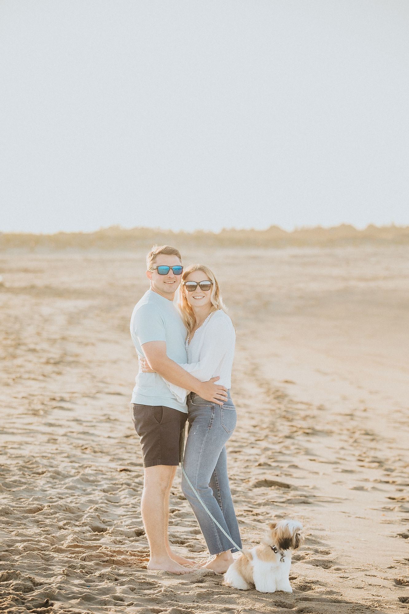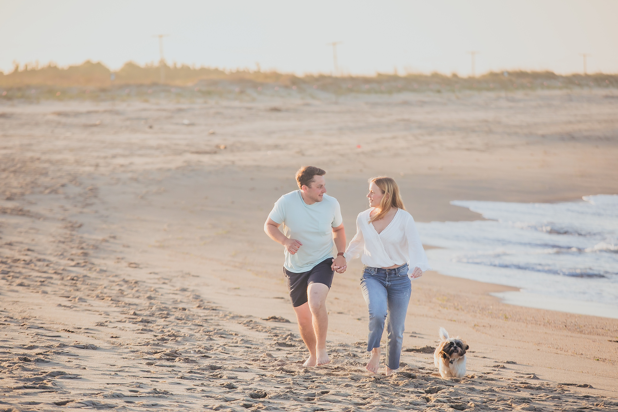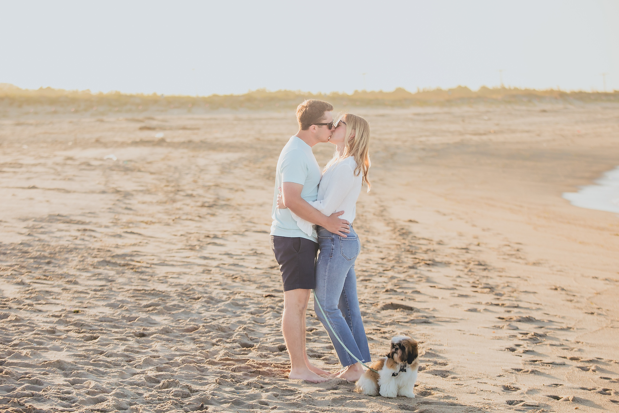 Transitioning to the beach, the couple strolled along the shoreline, the gentle waves lapping at their feet. The soft, golden hues of the setting sun cast a warm glow, enhancing the romantic atmosphere. They paused by the dunes, framed by tall grasses swaying in the ocean breeze, creating intimate moments that reflected their deep connection. The expansive horizon and distant silhouette of New York City added a sense of grandeur to the scene.