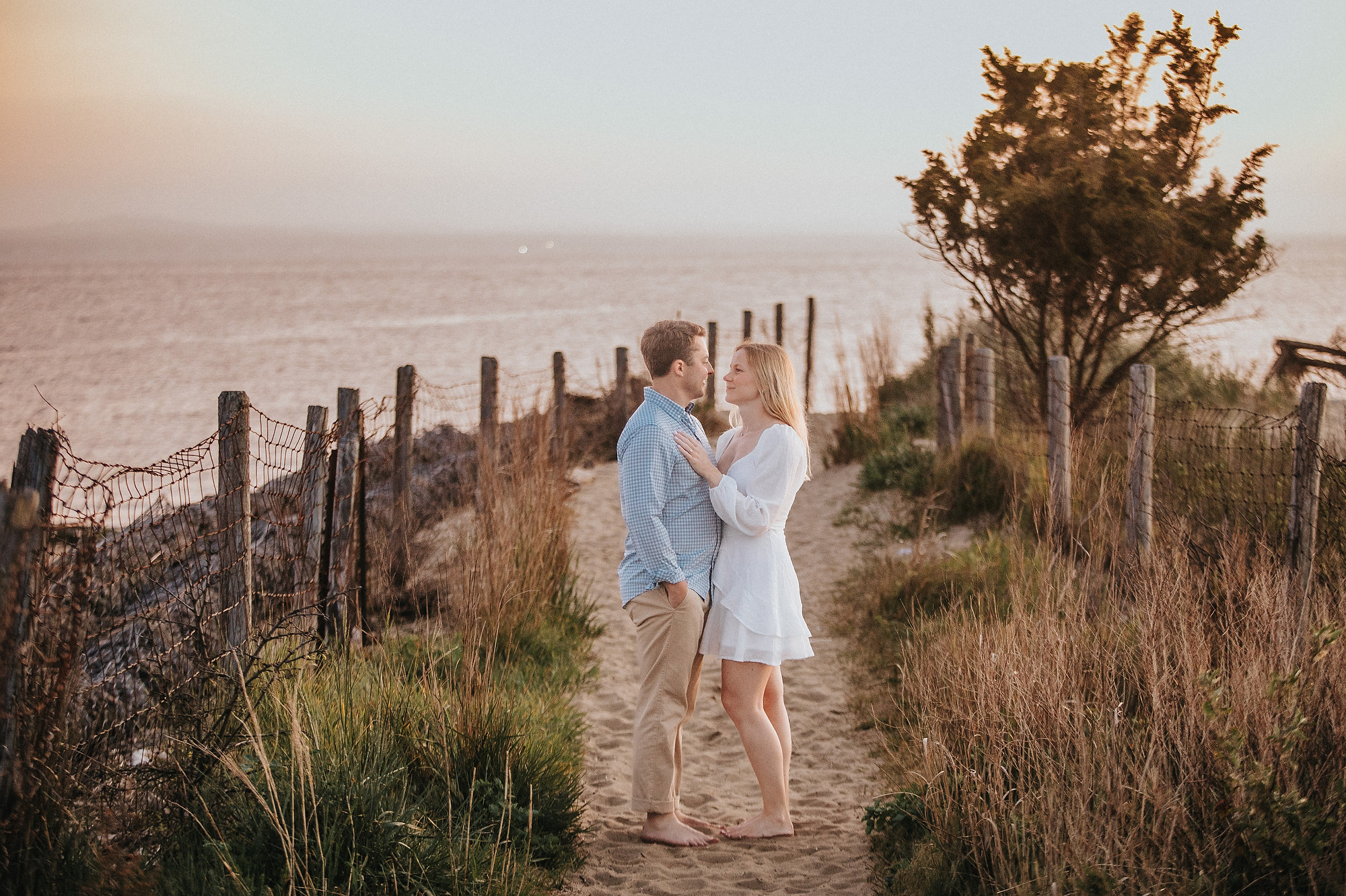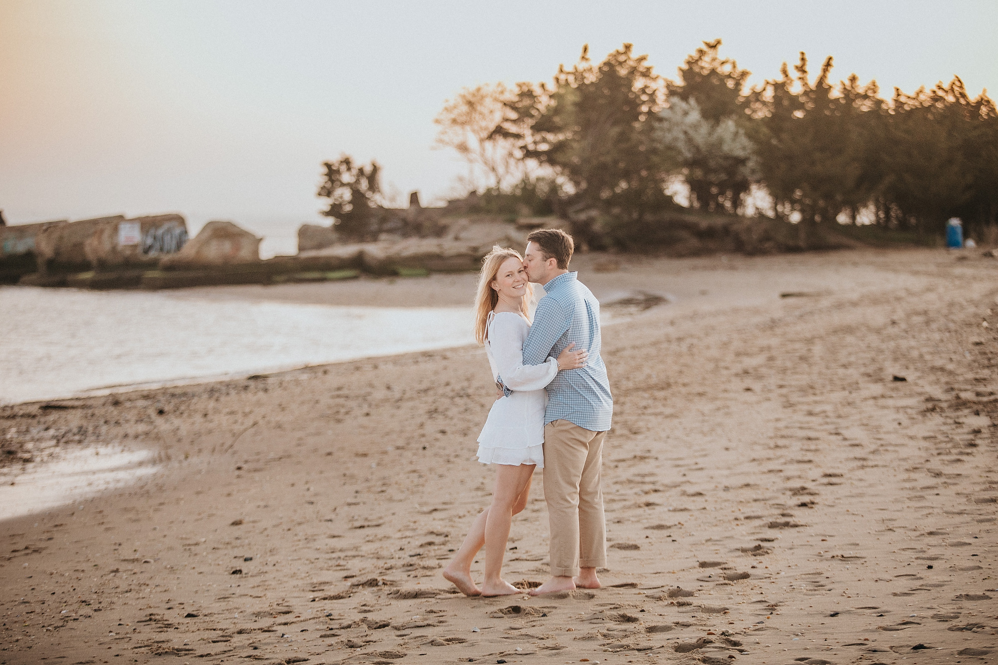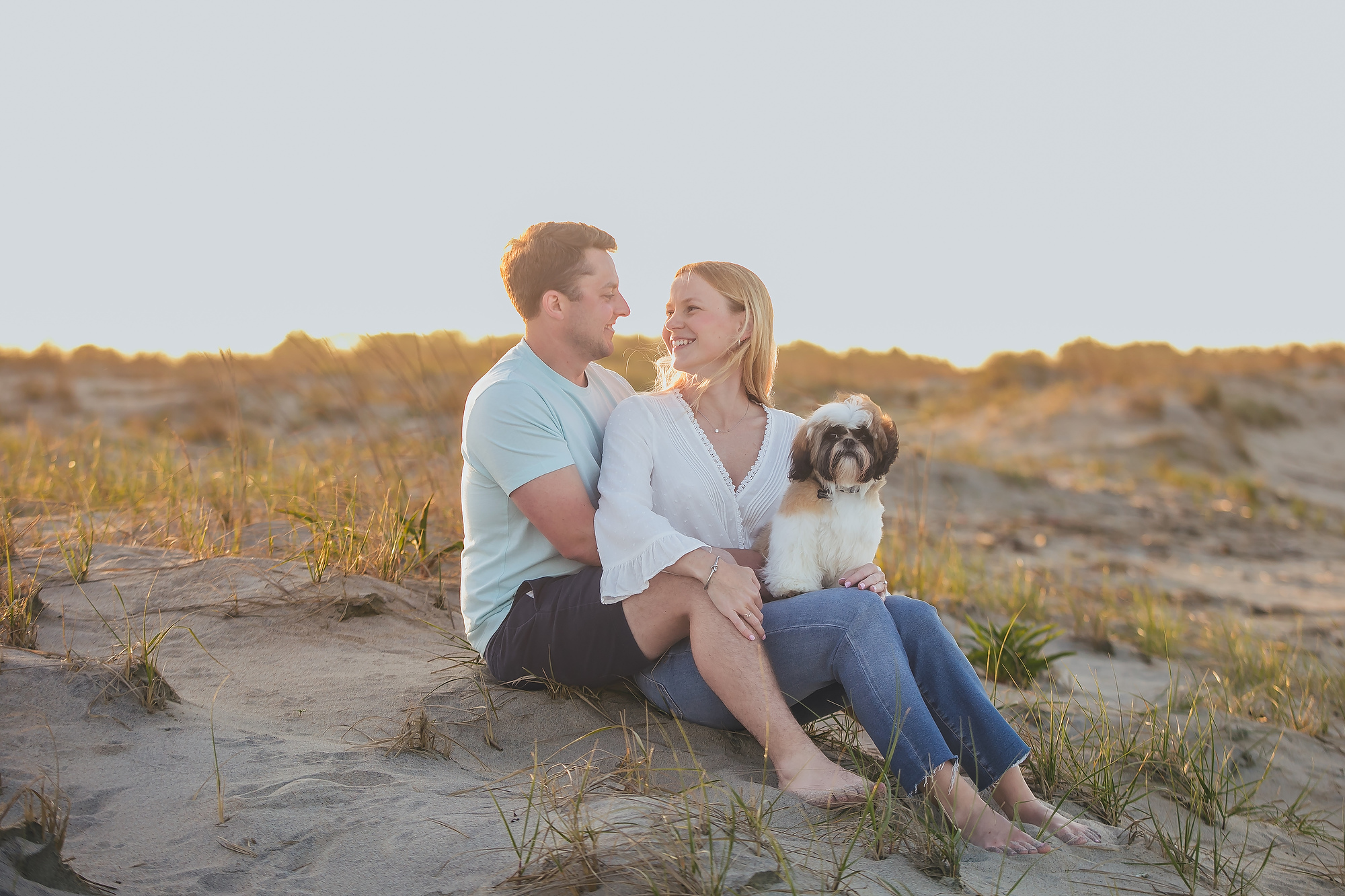 Transitioning to the beach, the couple strolled along the shoreline, the gentle waves lapping at their feet. The soft, golden hues of the setting sun cast a warm glow, enhancing the romantic atmosphere. They paused by the dunes, framed by tall grasses swaying in the ocean breeze, creating intimate moments that reflected their deep connection. The expansive horizon and distant silhouette of New York City added a sense of grandeur to the scene.
