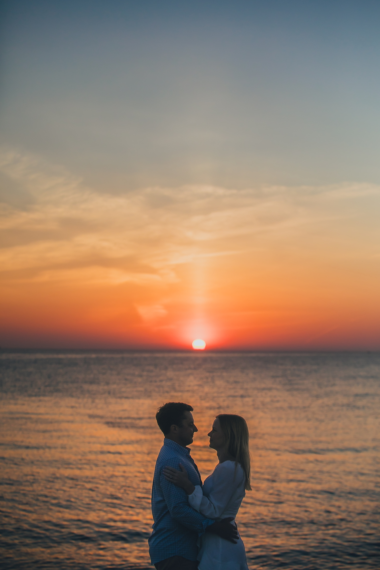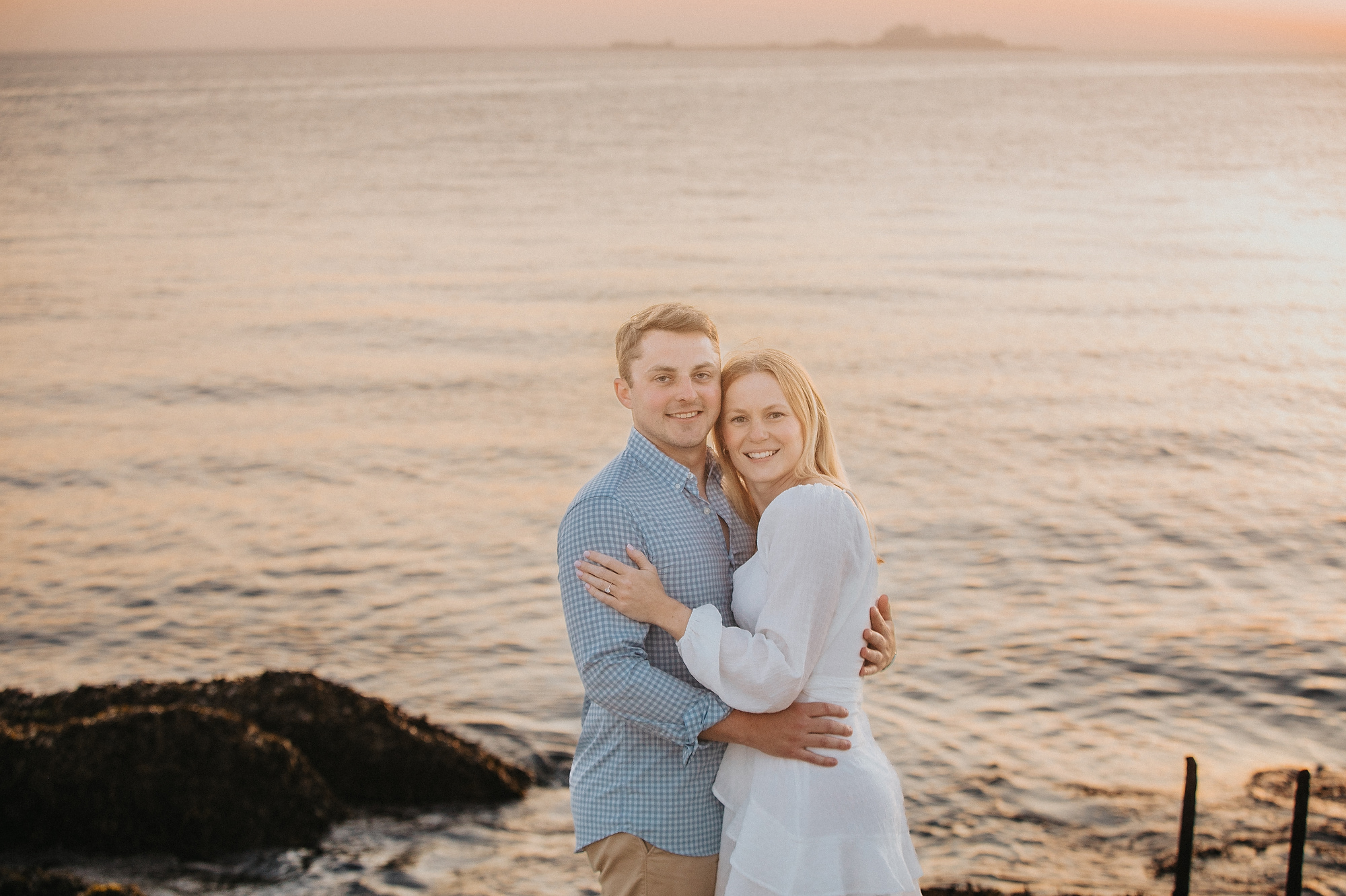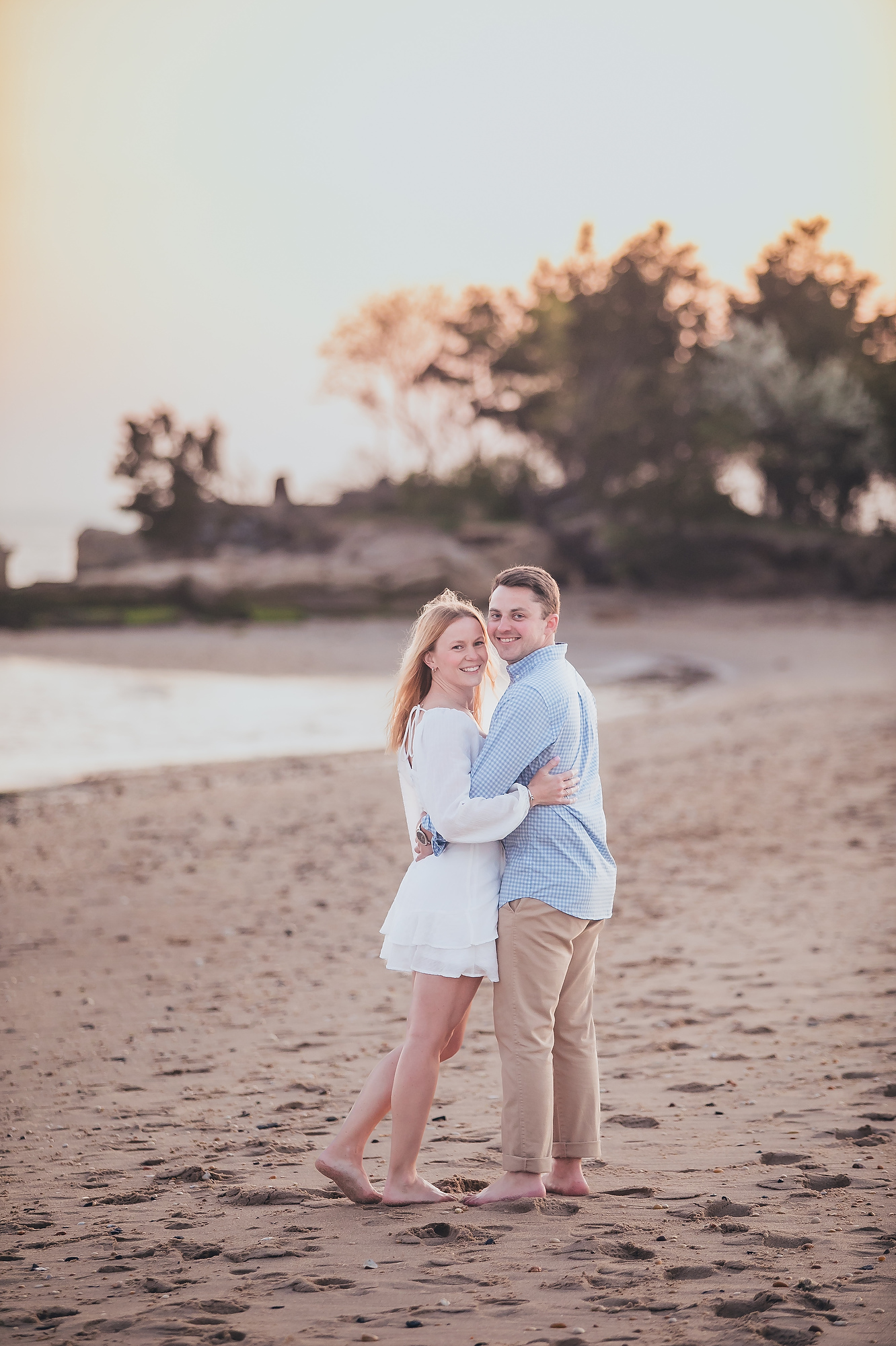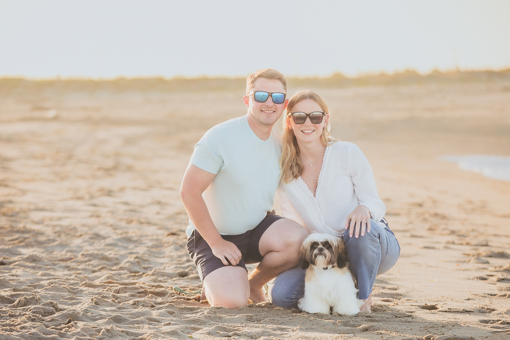 Transitioning to the beach, the couple strolled along the shoreline, the gentle waves lapping at their feet. The soft, golden hues of the setting sun cast a warm glow, enhancing the romantic atmosphere. They paused by the dunes, framed by tall grasses swaying in the ocean breeze, creating intimate moments that reflected their deep connection. The expansive horizon and distant silhouette of New York City added a sense of grandeur to the scene.