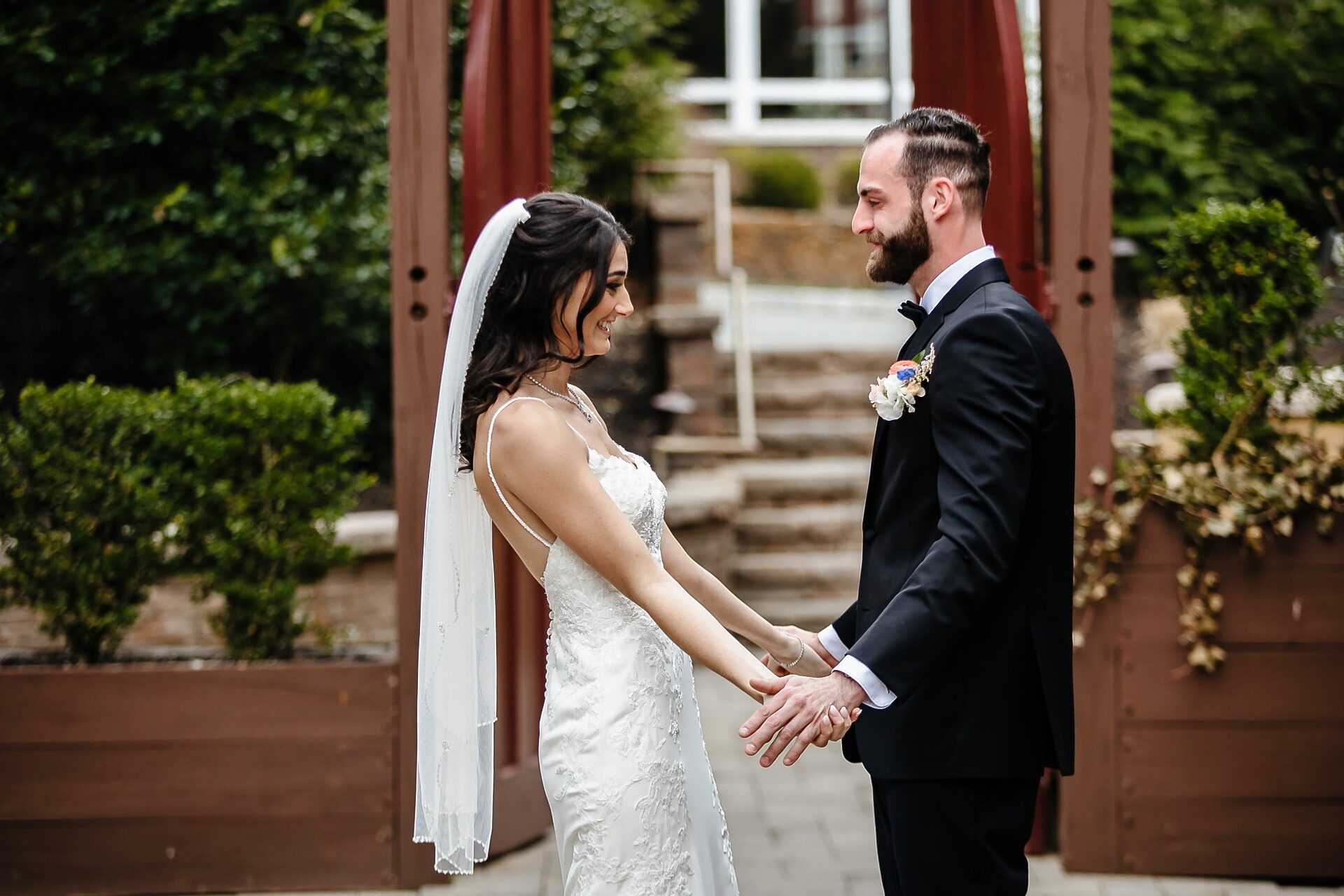 Their ceremony began at 6:00 PM under soft, golden light that filtered through the trees—a dream for any New Jersey wedding photographer. Surrounded by their closest family and friends, the couple exchanged vows with heartfelt emotion. Guests were seated in a beautifully arranged courtyard while a violinist added a romantic soundtrack to the proceedings.